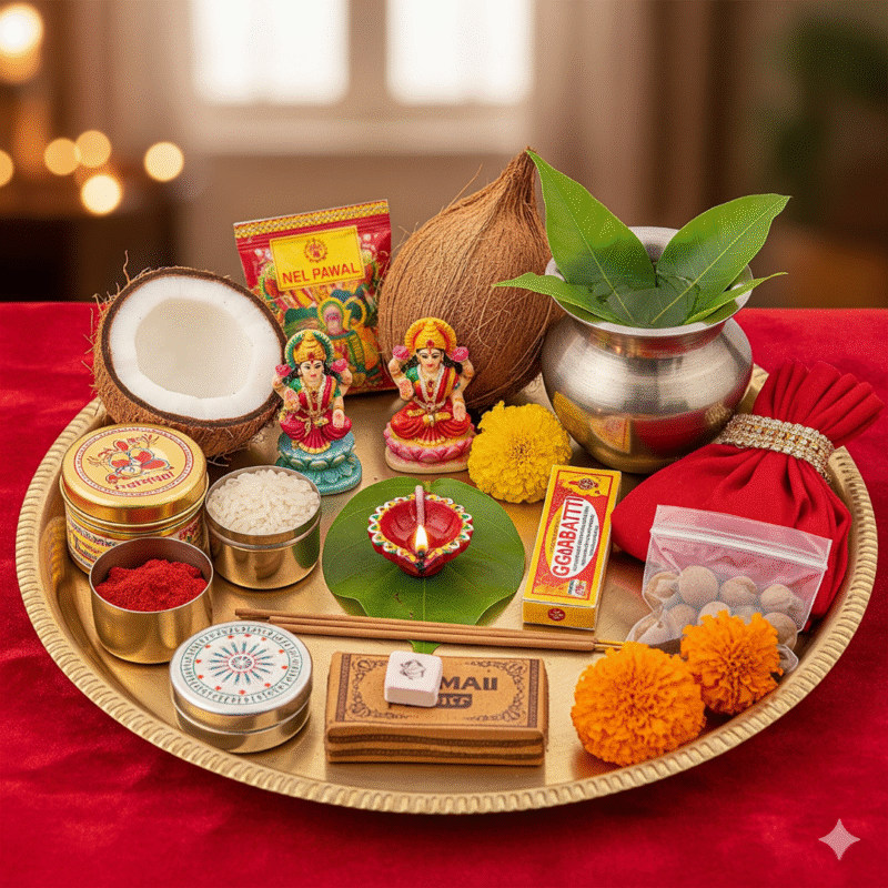 This kit includes all the essentials, such as roli, rice, kalawa, haldi, sindoor, gulal, diya, kapoor, incense sticks, ghee, cotton wicks, supari, coins, sweets, fruits, flowers, kalash, coconut, pooja cloths, and decorative items. Every element is thoughtfully chosen to ensure purity and completeness, making it perfect for celebrating Diwali at home, office, or shop.