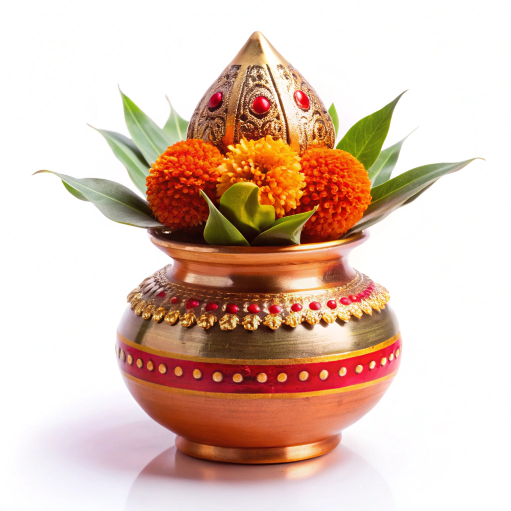 Fill the Kalash with water, place mango leaves around the mouth, and keep a coconut on top to invite blessings of health, wealth, and happiness.