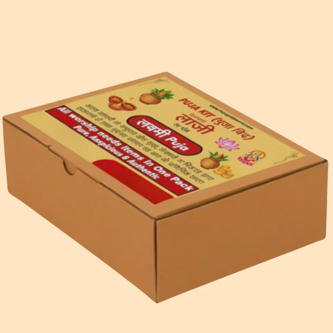 This kit includes all the essentials, such as roli, chawal, kalawa, haldi, sindoor, gulal, diya, kapoor, incense sticks, ghee, cotton wicks, supari, coconut, kalash, pooja cloths, coins, sweets, flowers, and decorative items. Every element is carefully selected to ensure purity and completeness, making it perfect for celebrating Lakshmi Puja at home, office, or shop.
